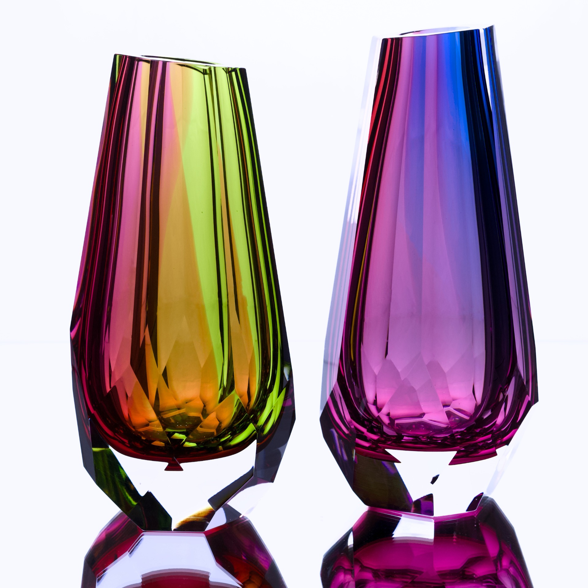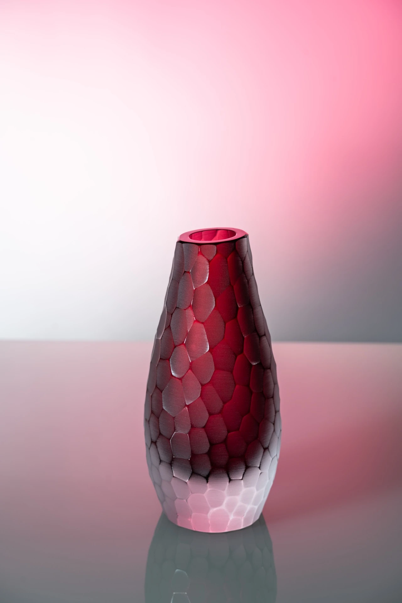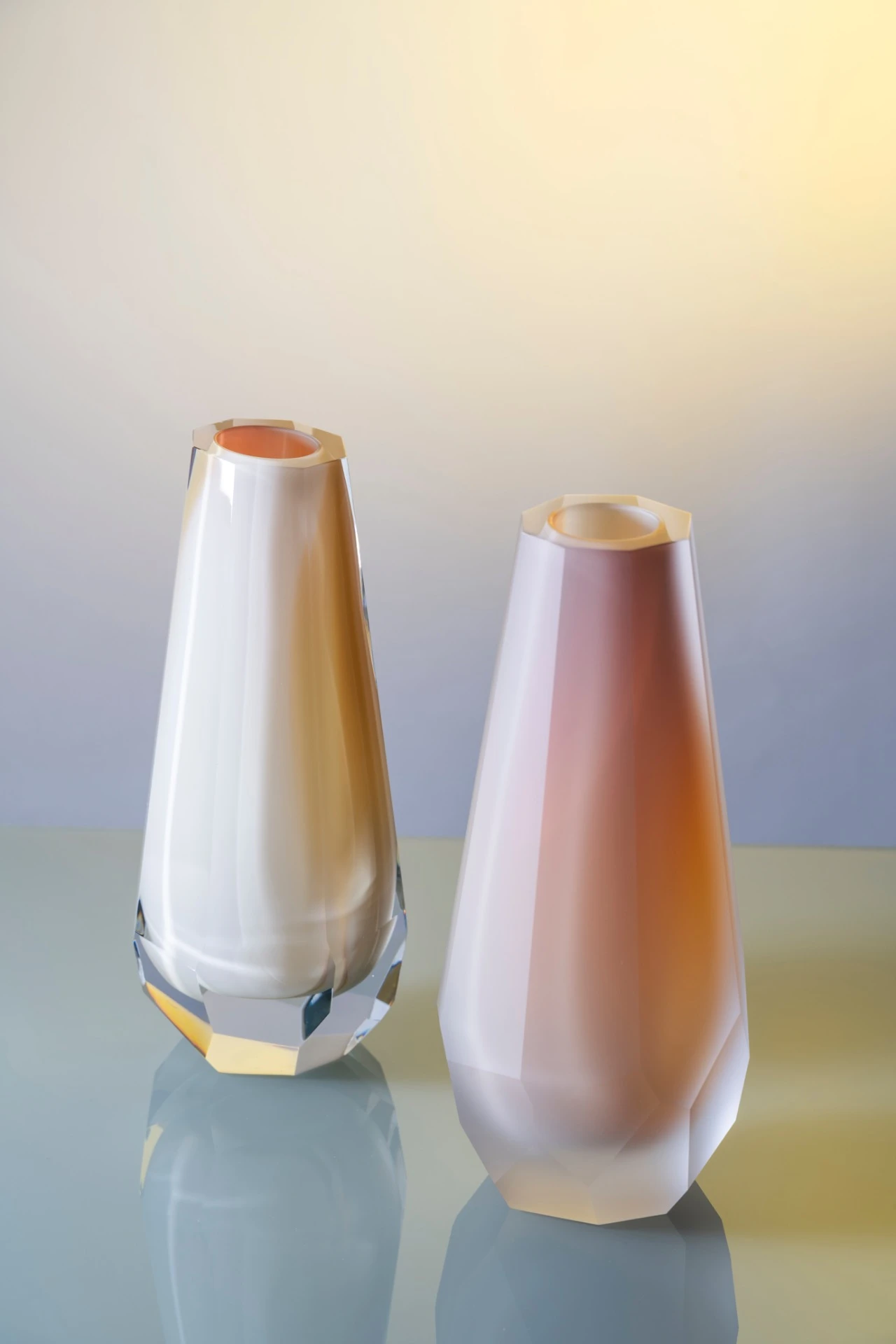 A series of vases/objects inspired by the spring planting of flowers and the awakening of nature from its winter slumber. The vases are hand blown into a wooden mould made from unique pinkish erbium glass. The unique subtle colour transition in the glass is caused by the so-called colouring glass rubies, which are hot-packed onto the base bulb of the glass.