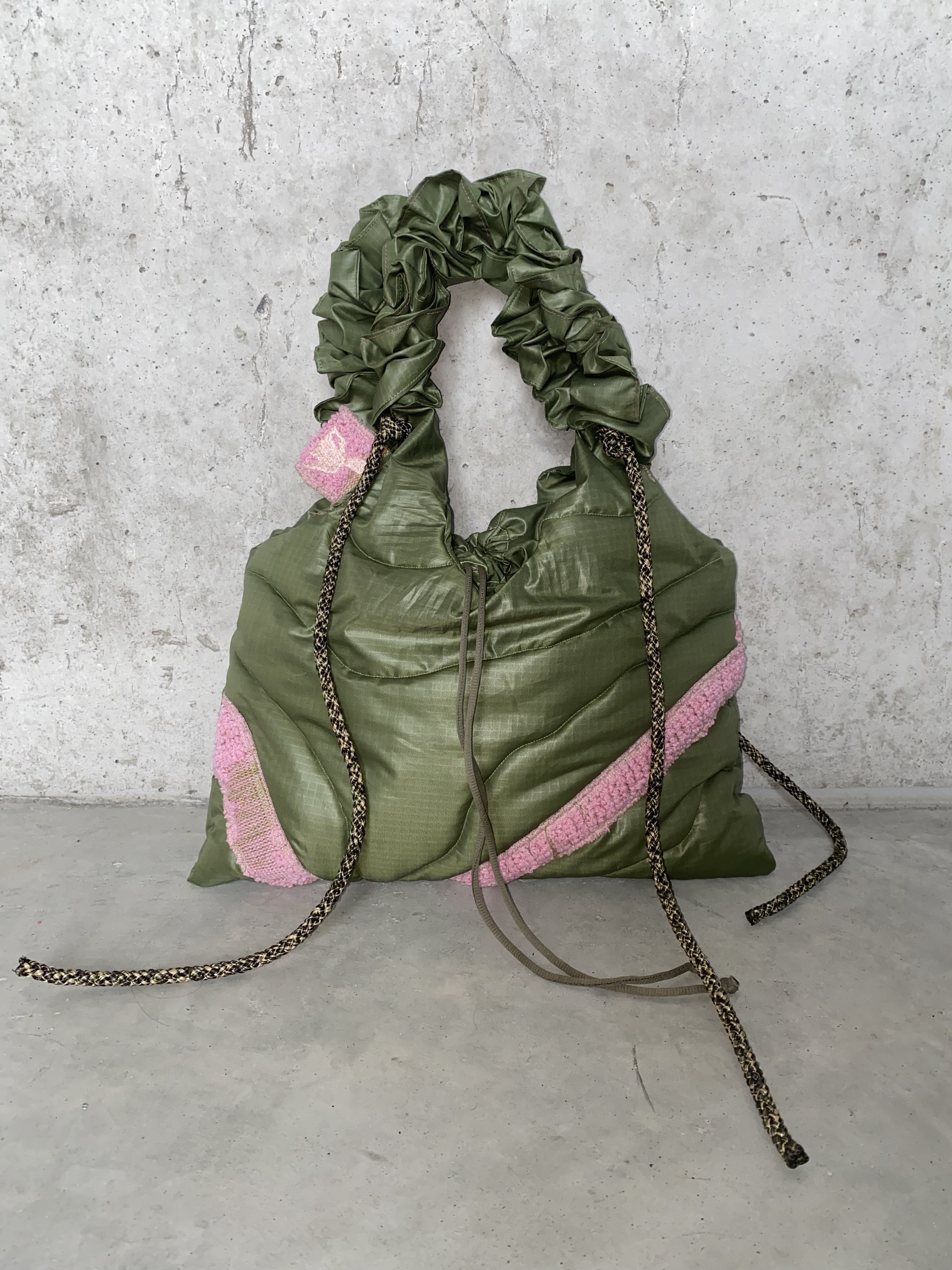 Due to the housing crisis, young middle-class people are missing the permanent home that generations before them owned. For these modern urban nomads, I therefore design a collection of “bags” that will help them move and become their imaginary snail shell. I use embroidery to give volume to a rectangle of fabric, as used in folk culture to carry things, but also strength at the joints. The embroidery, which here ironically critiques rental housing, is not a decoration but a functional structural element and a carrier of meaning. The result is four products: a shopping bag, a raincoat, an apron and a loom. All of them can be easily packed into a rucksack or unfolded for storage.