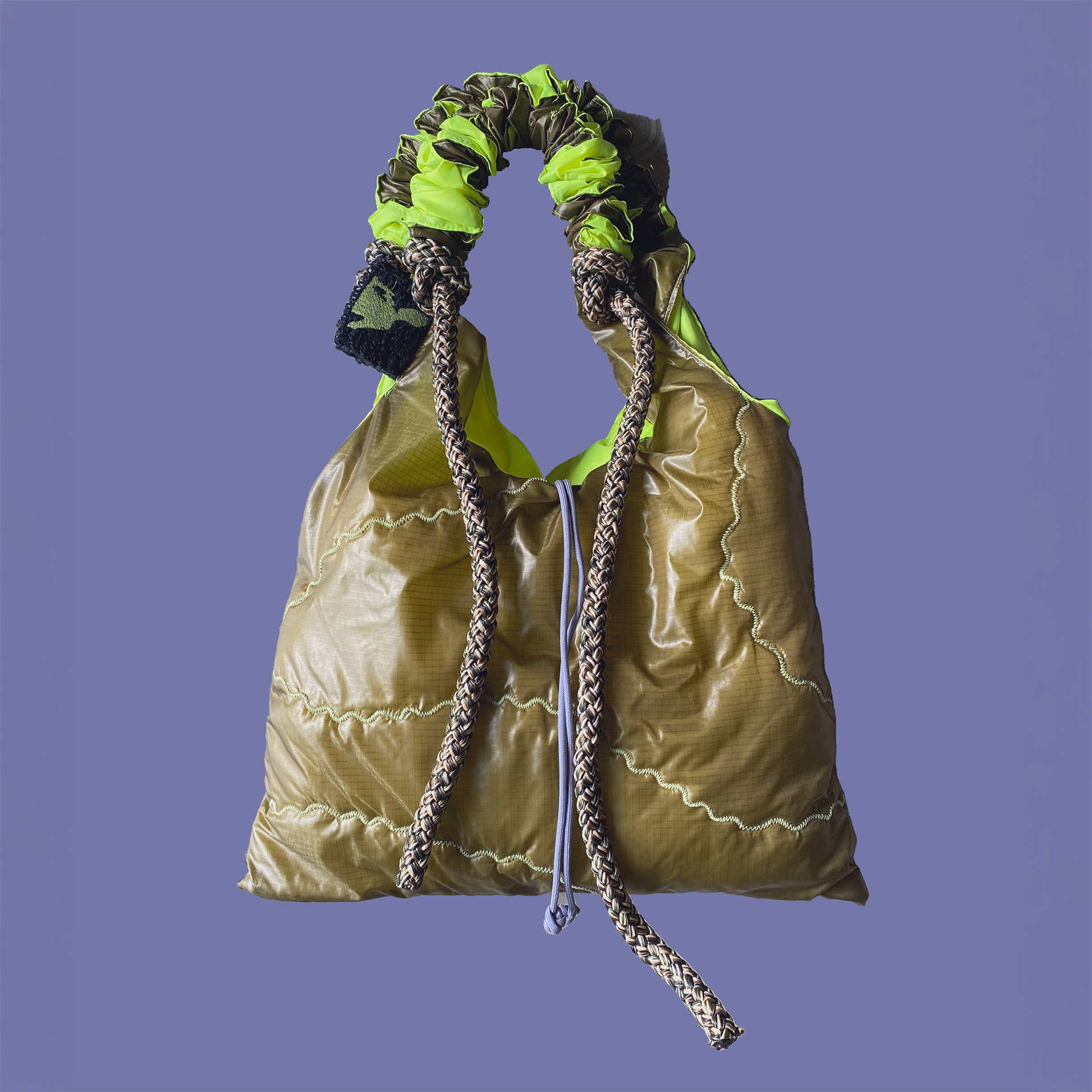 The bags are made from climbing ropes that no longer meet technical standards and leftover textile materials, giving them a new chance to exist beyond their original purpose. The wool scarves are created on a hand-operated knitting machine using a special technique resembling terry cloth and carry within them traces of automatic drawings. Each piece is created intuitively, taking into account the available materials, which is why no two pieces are ever the same.