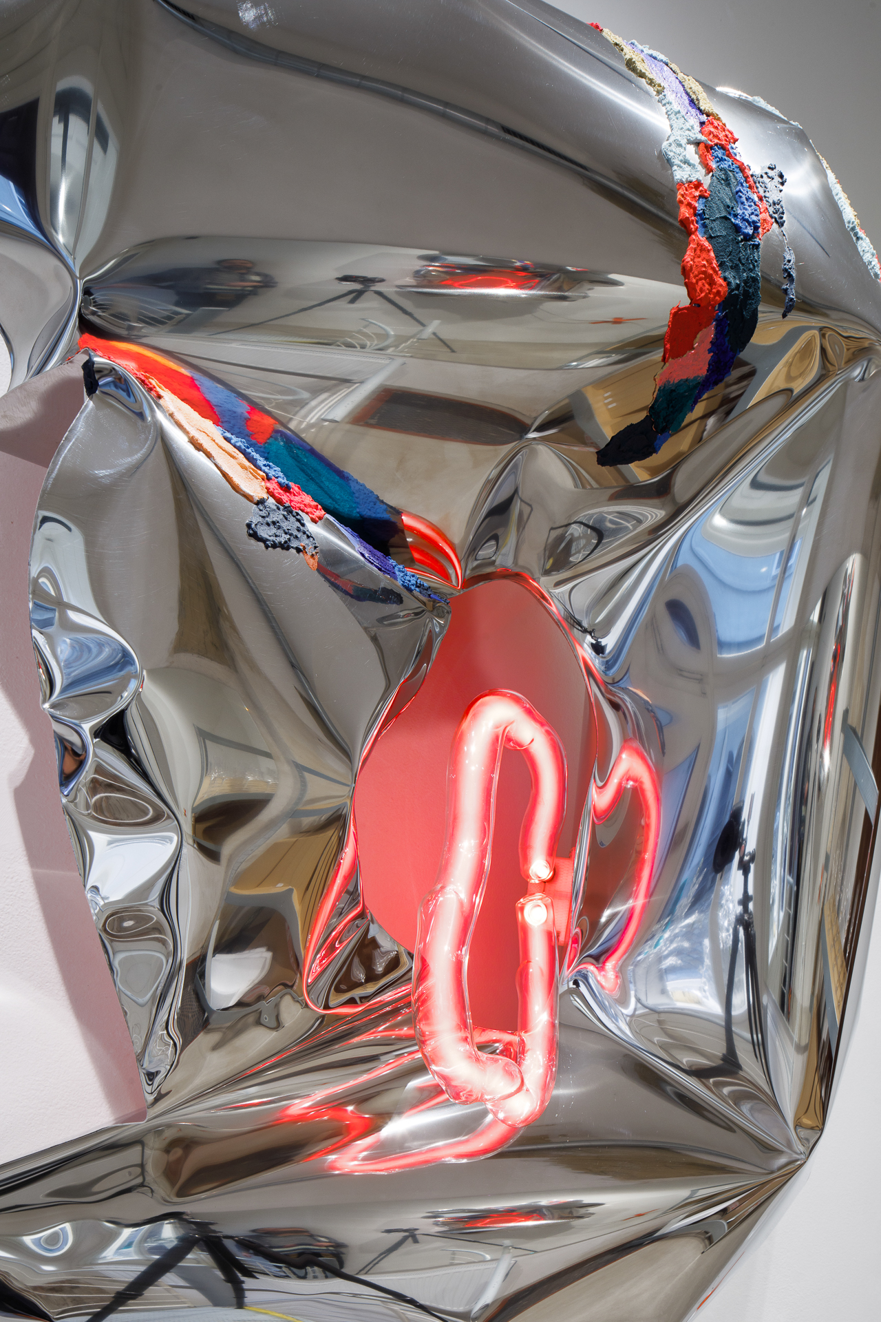 AISI 304 S.02, 150x100x40 cm, nerezová ocel, strukturální malba, ručně foukaný skleněný neon od Lucie Jindrák Skřivánkové, české multidisciplinární umělkyně. Její tvorba se pohybuje na pomezí malby, textilu, objektu a světelné instalace.