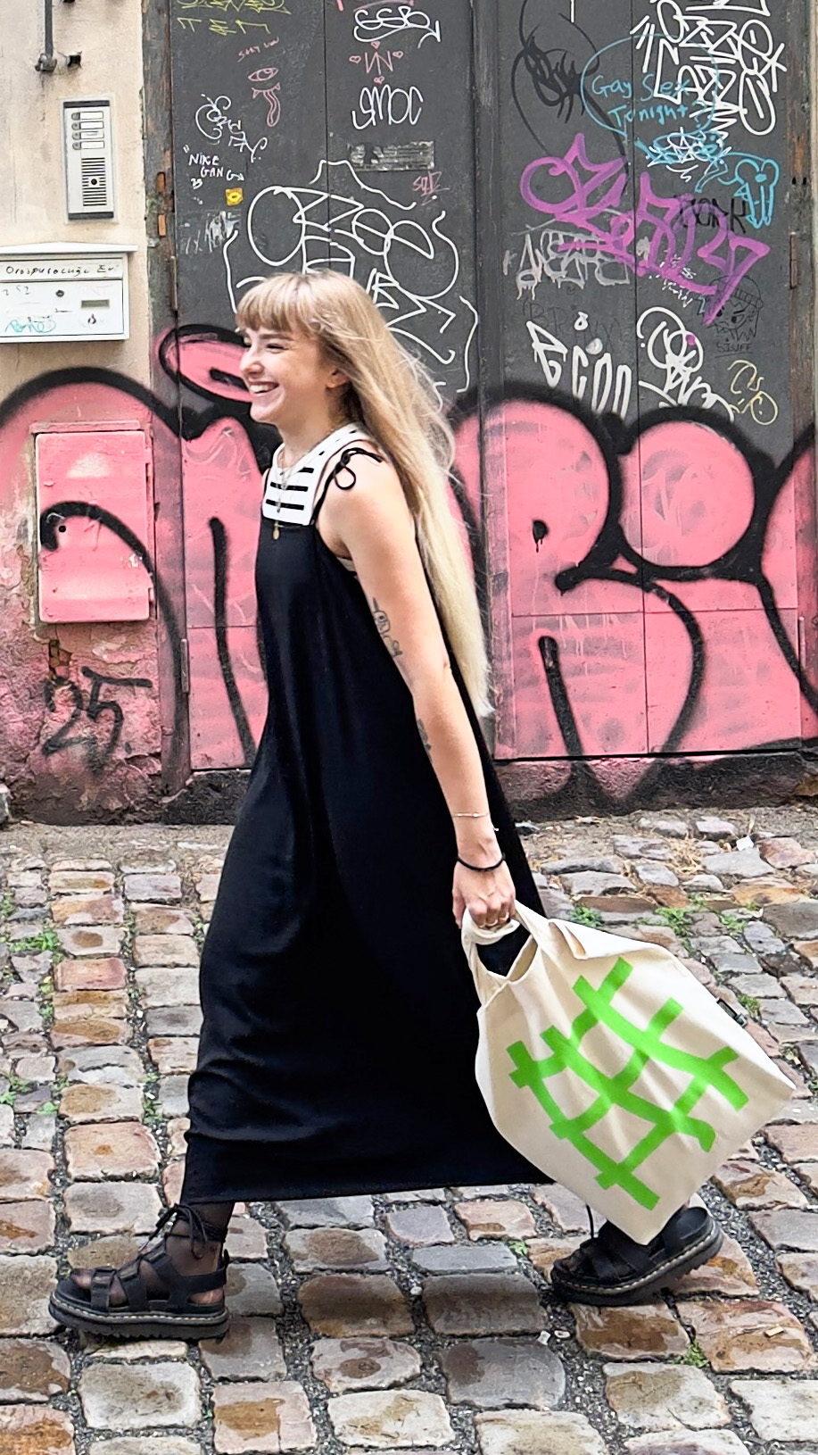 Nákupní taška THE DESIGN – mřížka. Taška má 210 g/m² a je vyrobená ze 100% certifikované bio bavlny. Zesílené švy ve zvláště namáhaných místech, délka rukojeti: 66 cm, lze nosit přes rameno nebo v ruce.