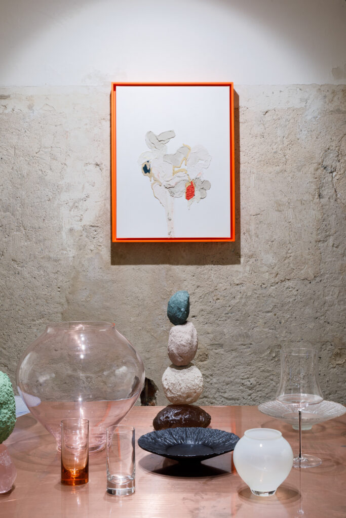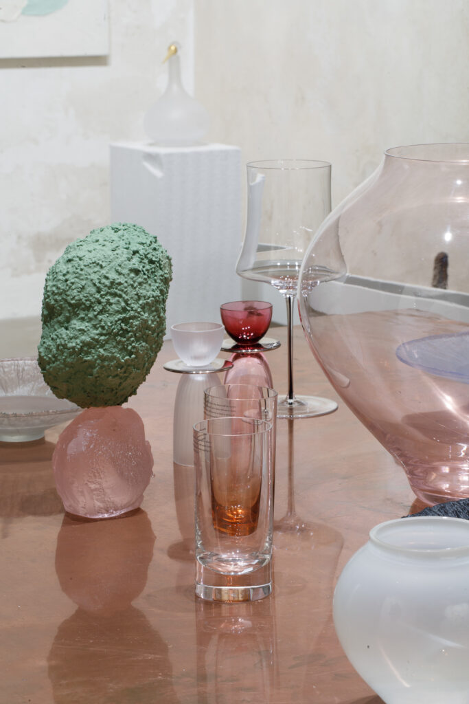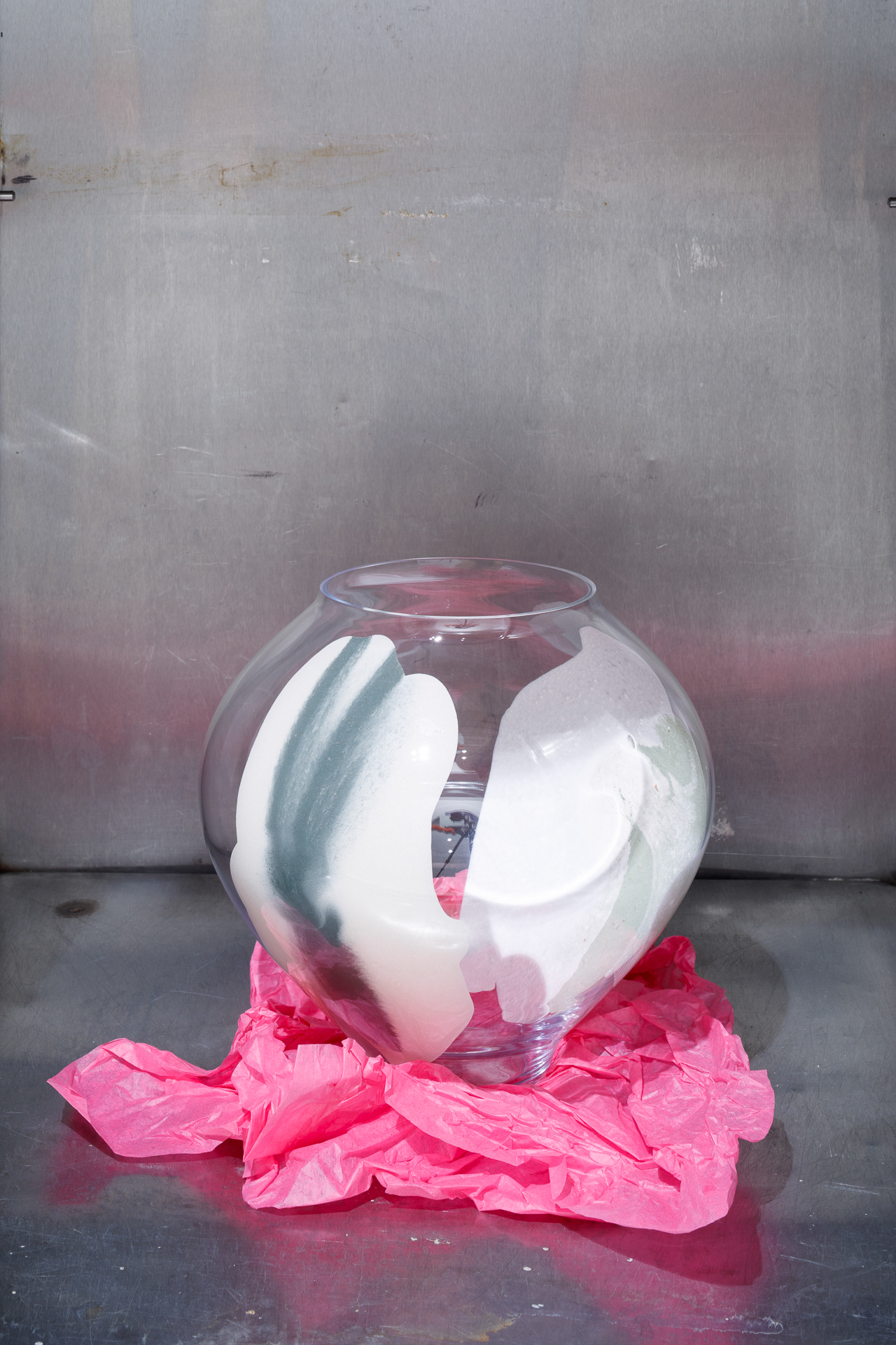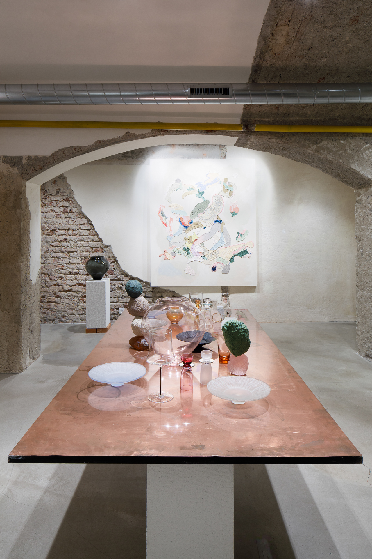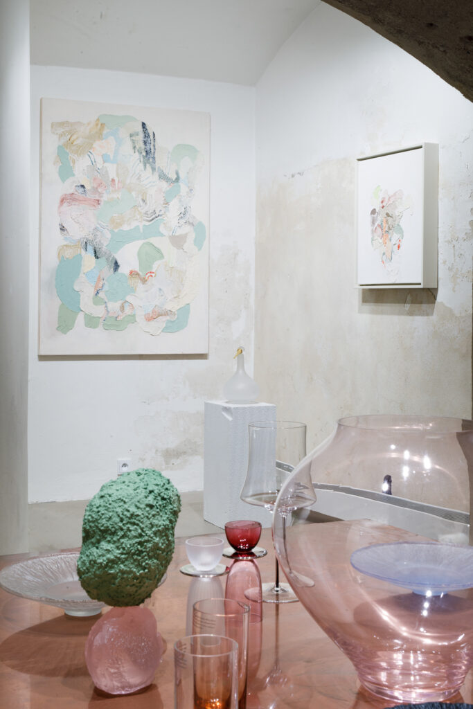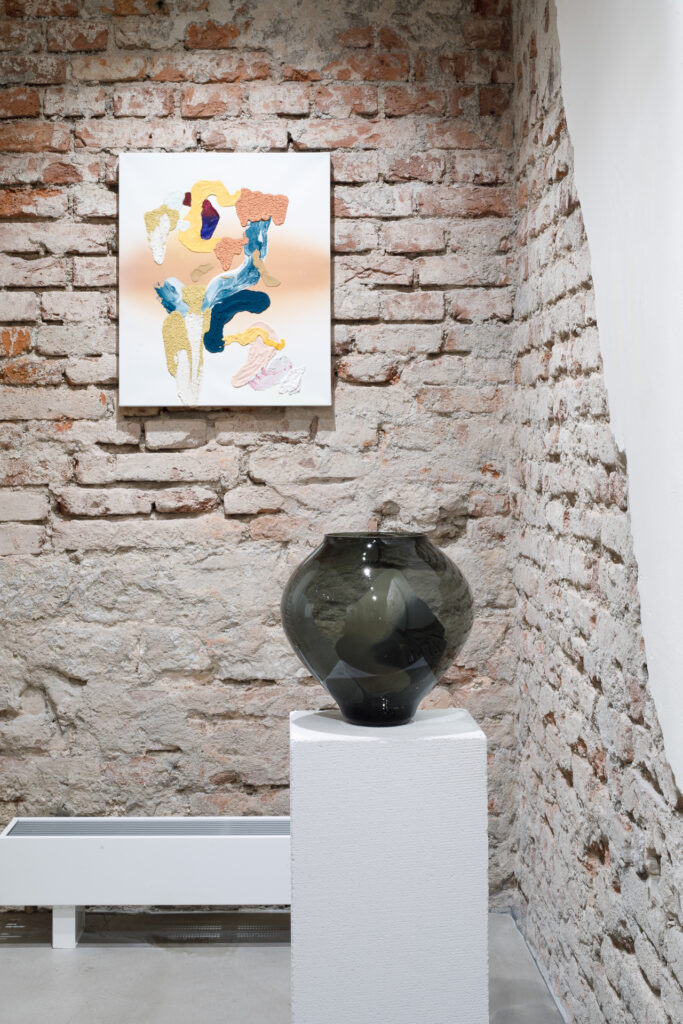 Ústředním objektem výstavy je reinterpretace tradiční korejské moon jar, jež se v tomto případě stává nositelem společné formy. Sklo, navržené Byoungchanem Yunem a vyfouknuté českými sklářskými mistry, se setkává s malbou Lucie Jindrák Skřivánkové, jež na jeho povrchu samovolně proudí, usazuje se, vzdoruje kontrole. Její malby vznikají bez zásahu štětce, skrze gravitaci, náhodu a důvěru v proces, který nelze plně řídit. Tento přístup se stává protiváhou k designérské preciznosti Yuna, který však i ve své tvorbě hledá křehkost, jemnost a napětí.