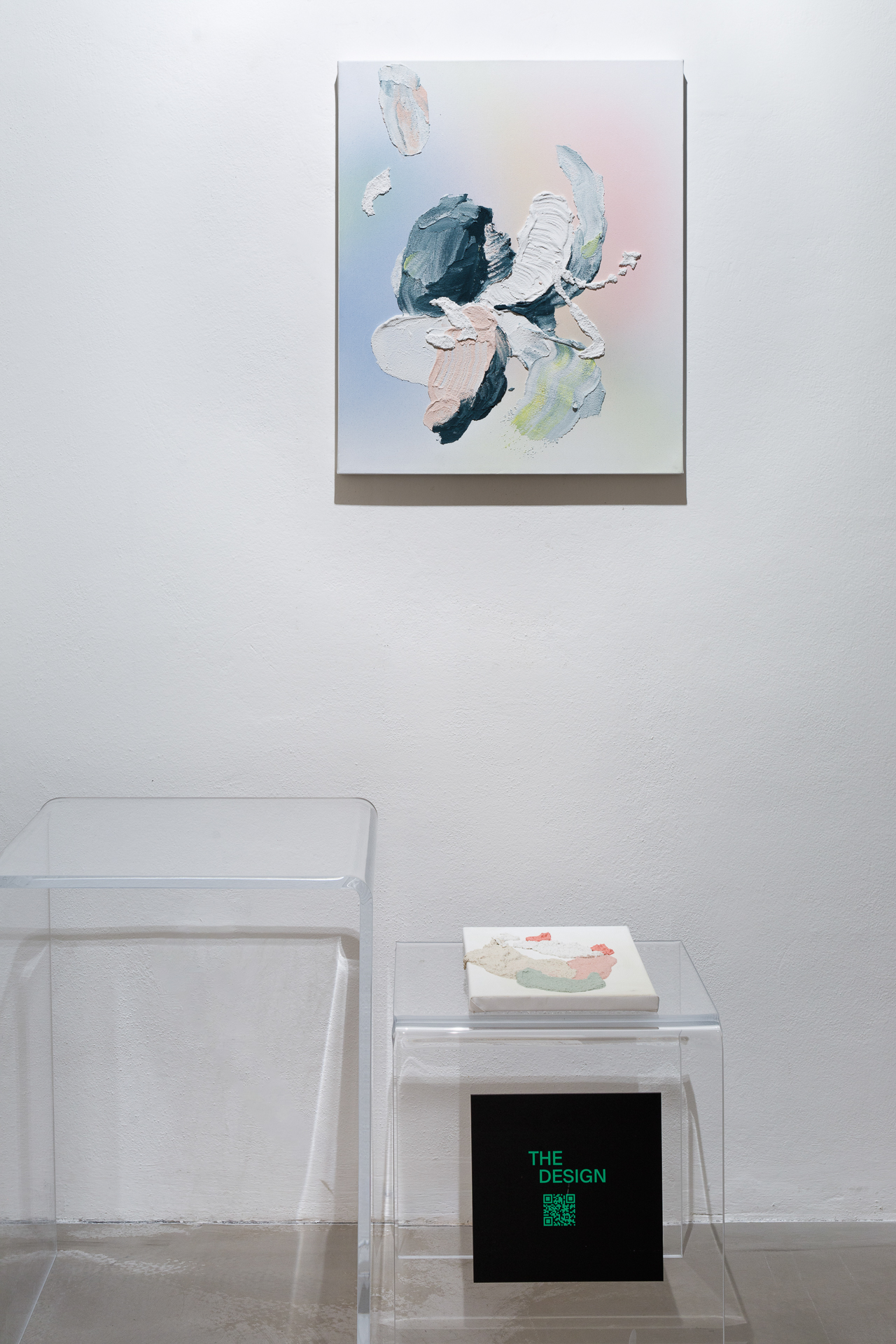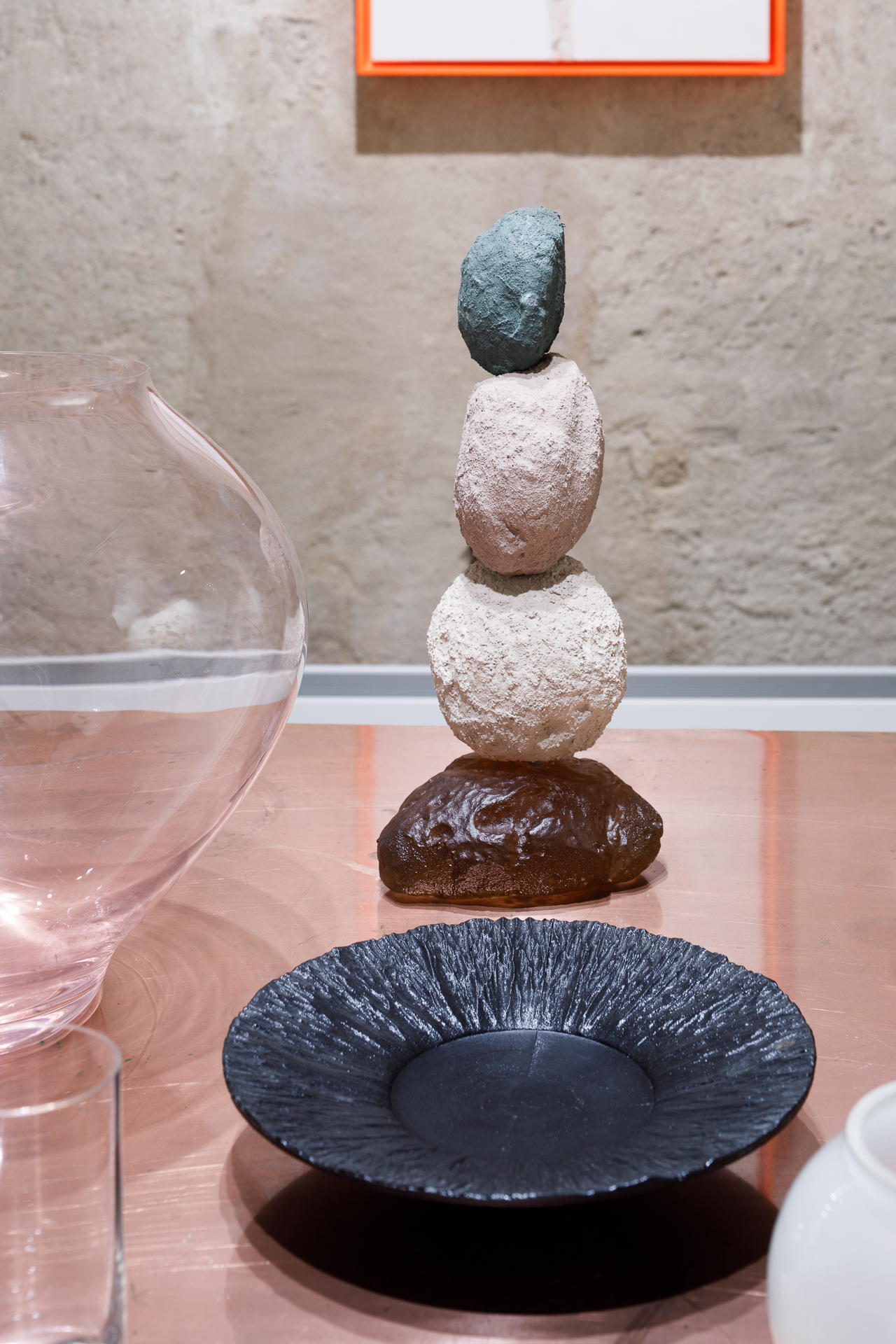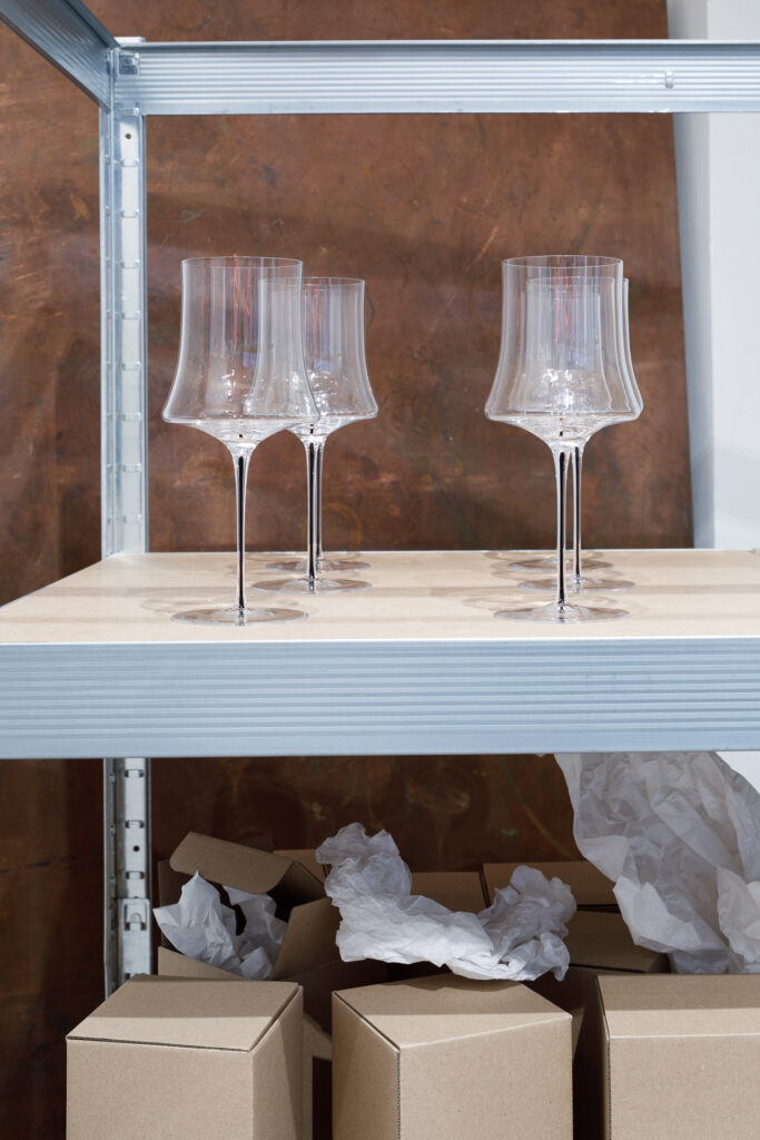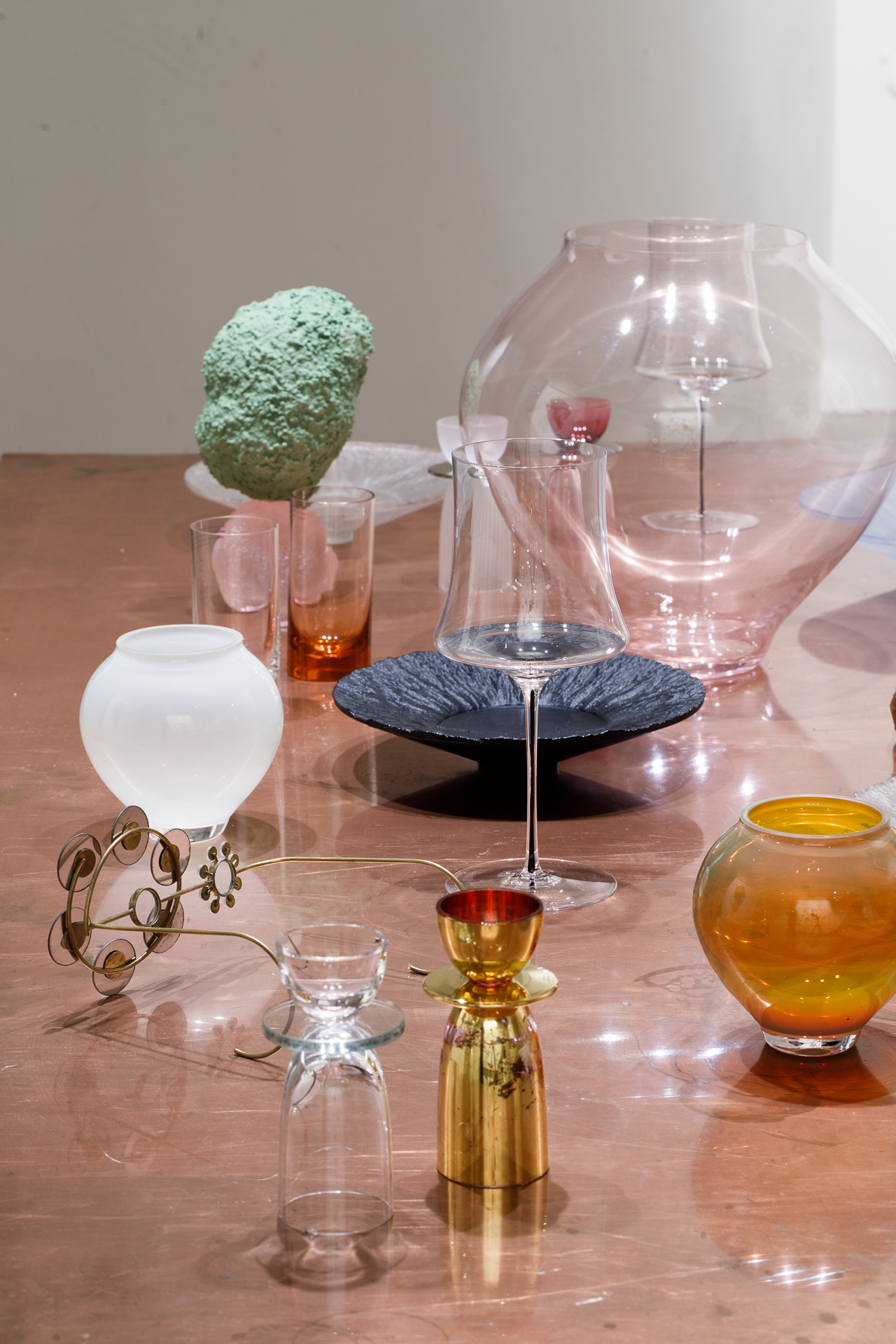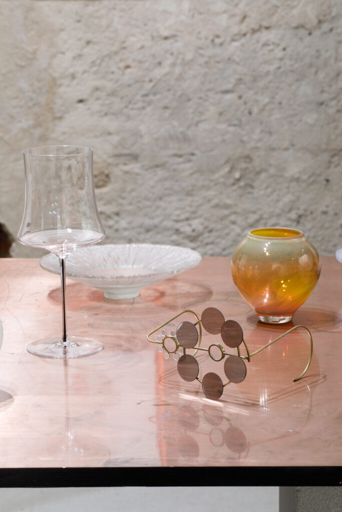 Ústředním objektem výstavy je reinterpretace tradiční korejské moon jar, jež se v tomto případě stává nositelem společné formy. Sklo, navržené Byoungchanem Yunem a vyfouknuté českými sklářskými mistry, se setkává s malbou Lucie Jindrák Skřivánkové, jež na jeho povrchu samovolně proudí, usazuje se, vzdoruje kontrole. Její malby vznikají bez zásahu štětce, skrze gravitaci, náhodu a důvěru v proces, který nelze plně řídit. Tento přístup se stává protiváhou k designérské preciznosti Yuna, který však i ve své tvorbě hledá křehkost, jemnost a napětí.
