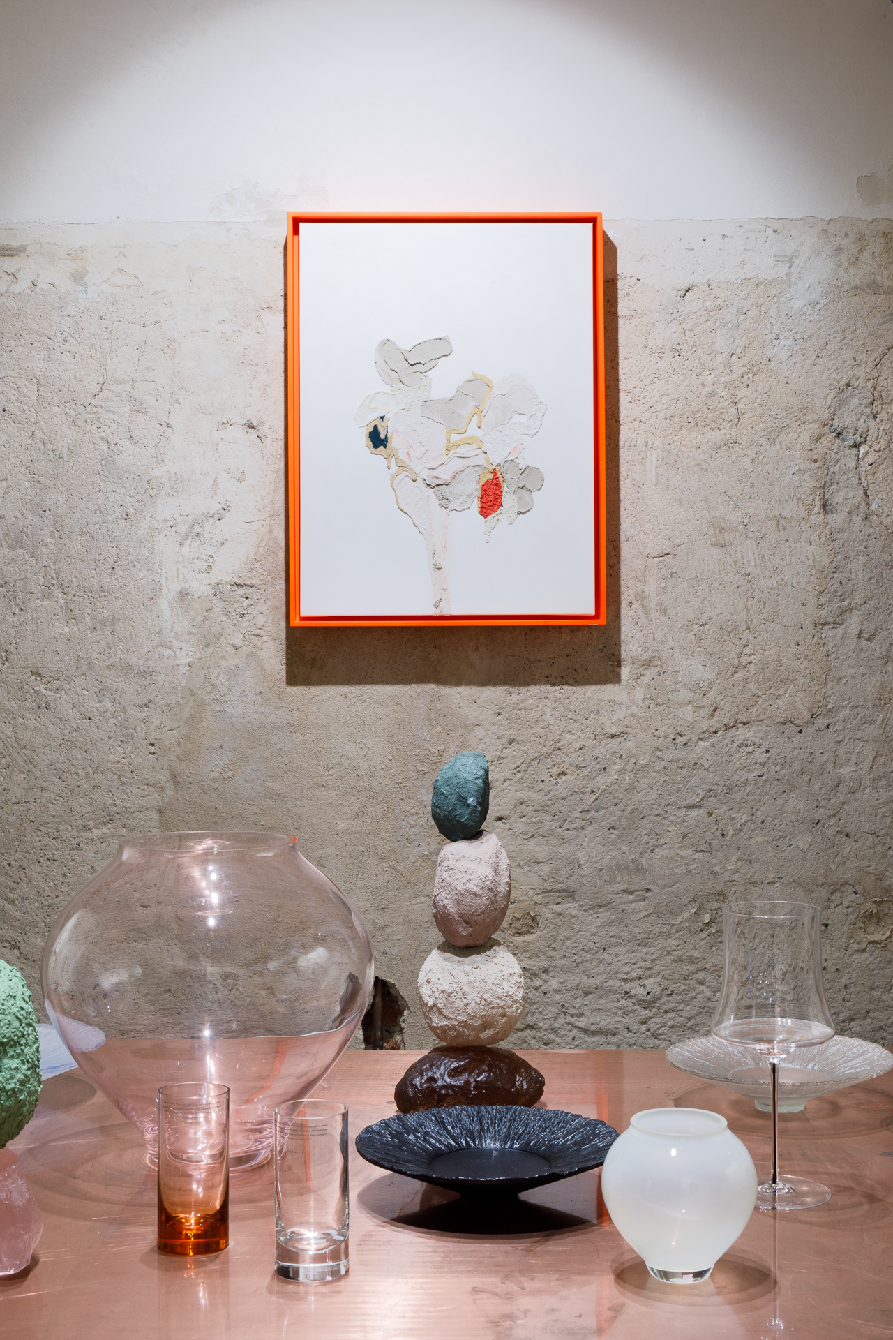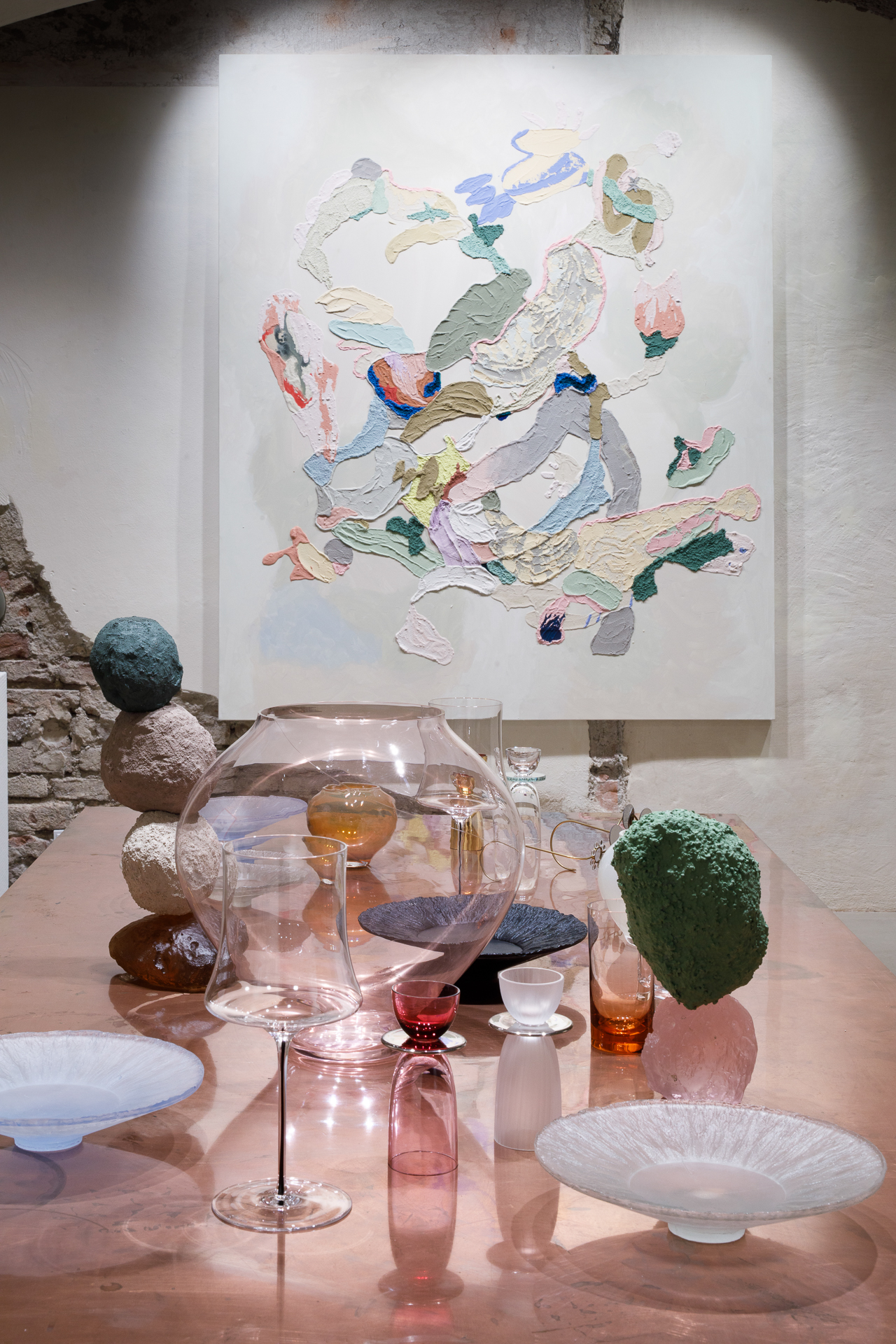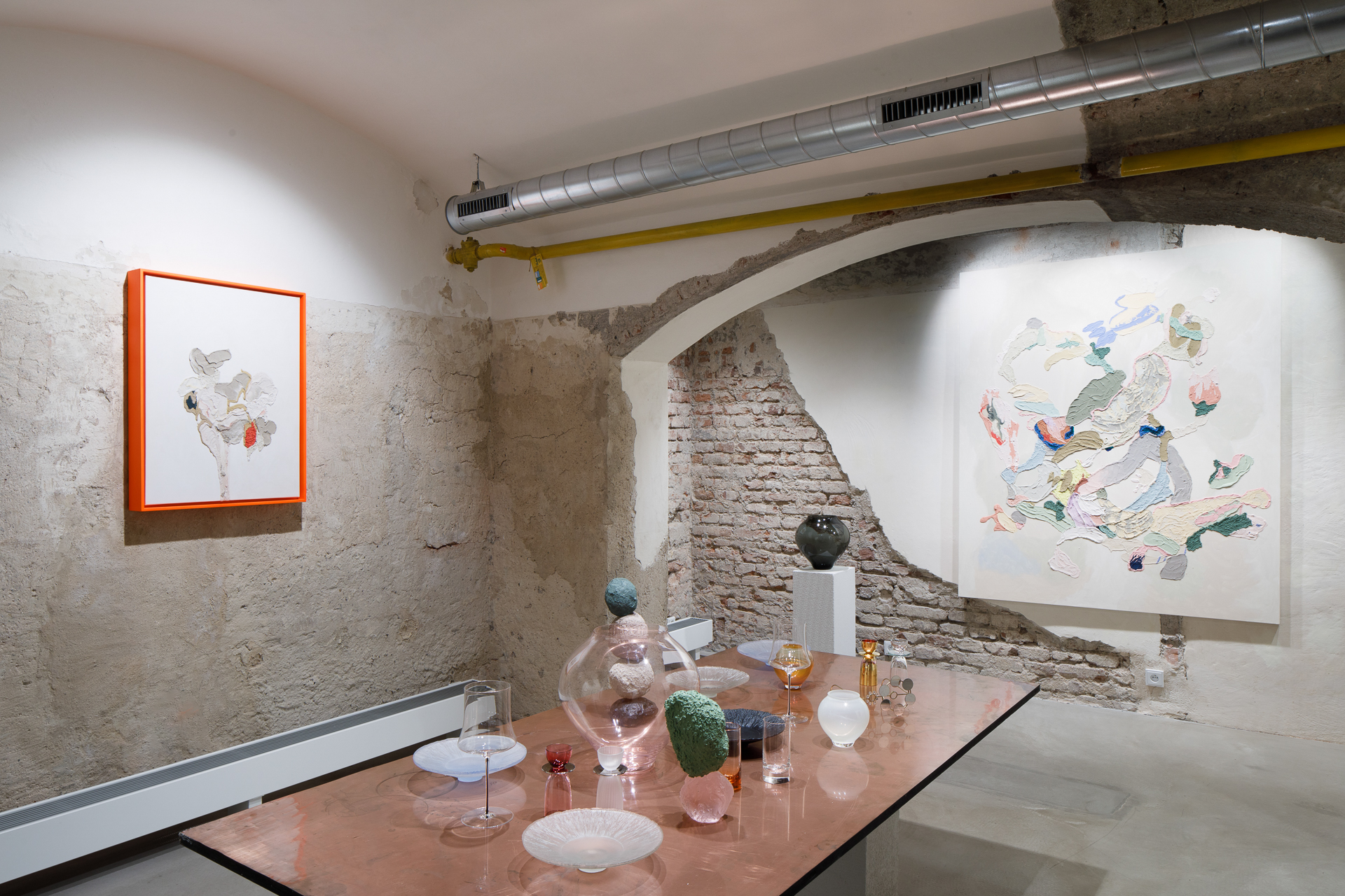 Každý z nich přistupuje ke svému médiu – skle a malbě – z jiného kulturního a materiálového zázemí, avšak v této výstavě vytvářejí společný prostor, kde se forma a tekutost, minulost a současnost vzájemně prolínají.